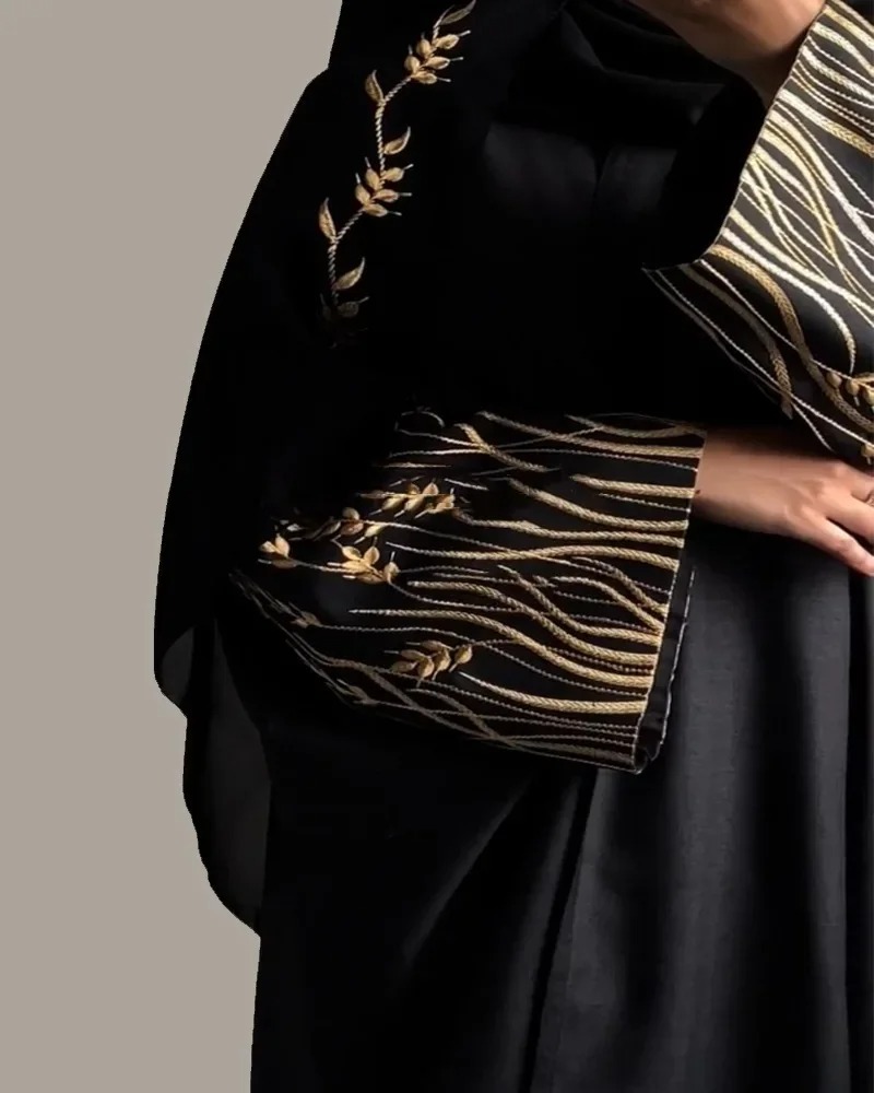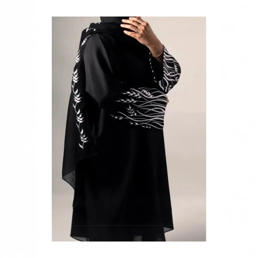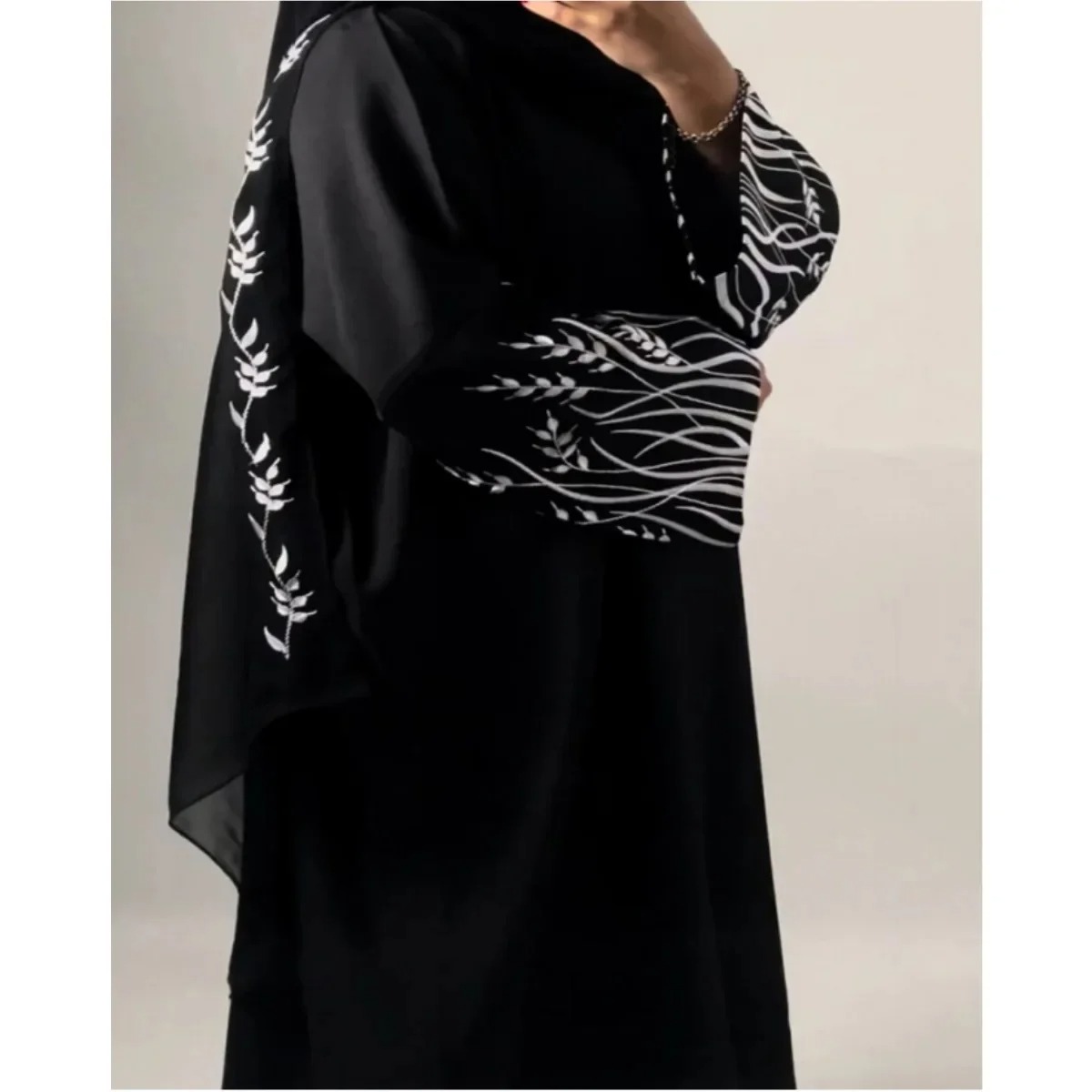 رداء طويل أنيق بتطريز عصري، يجمع بين التصميم العربي التقليدي والأناقة المعاصرة، مثالي للنساء المسلمات للارتداء اليومي والمناسبات.